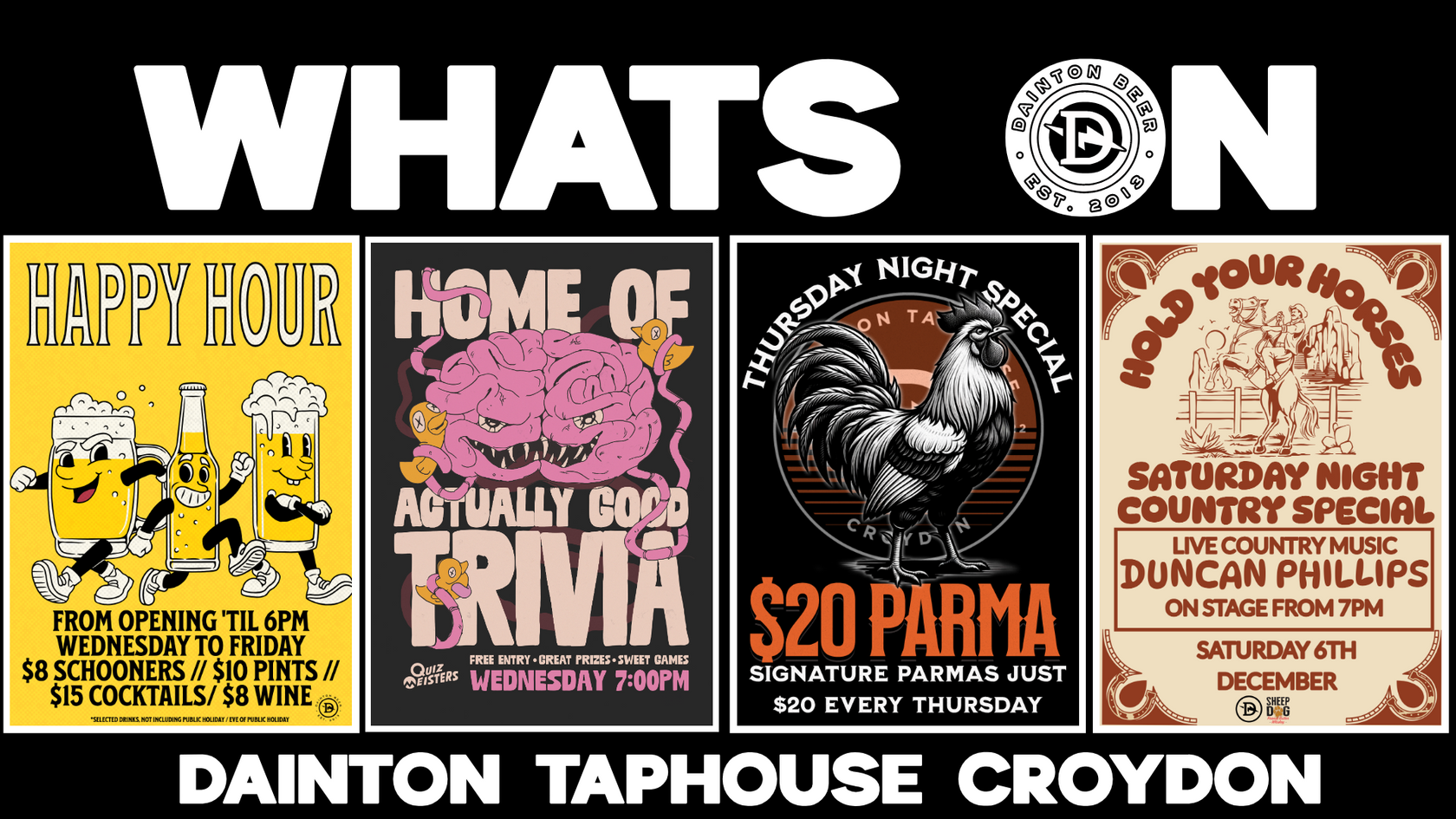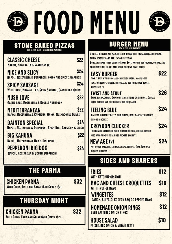 Our Croydon Taphouse is open to the public five days a week from Wednesday to Sunday. Enjoy a range of core and limited Dainton releases, as well as a locally-sourced cider, all expertly poured from our 14 custom taps.